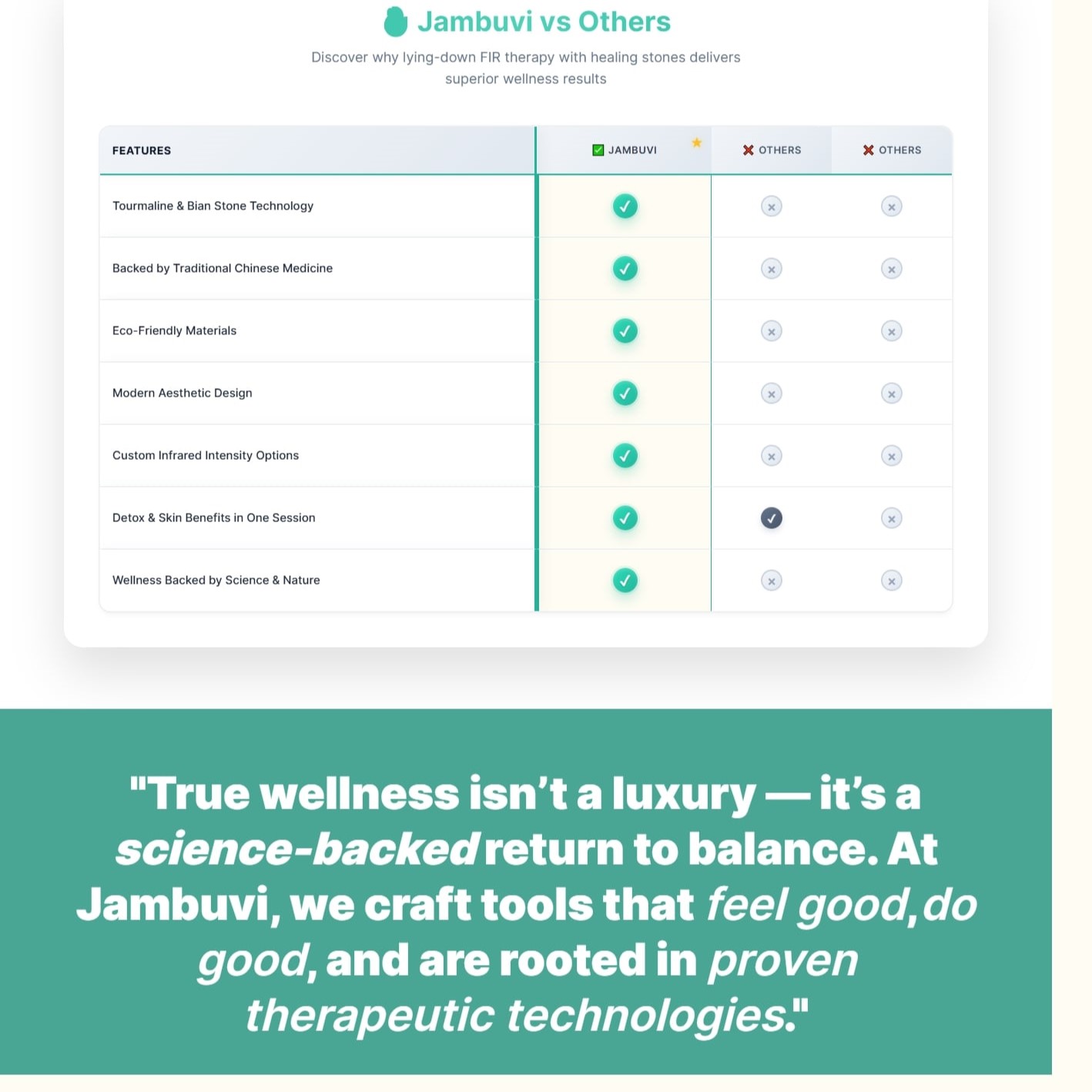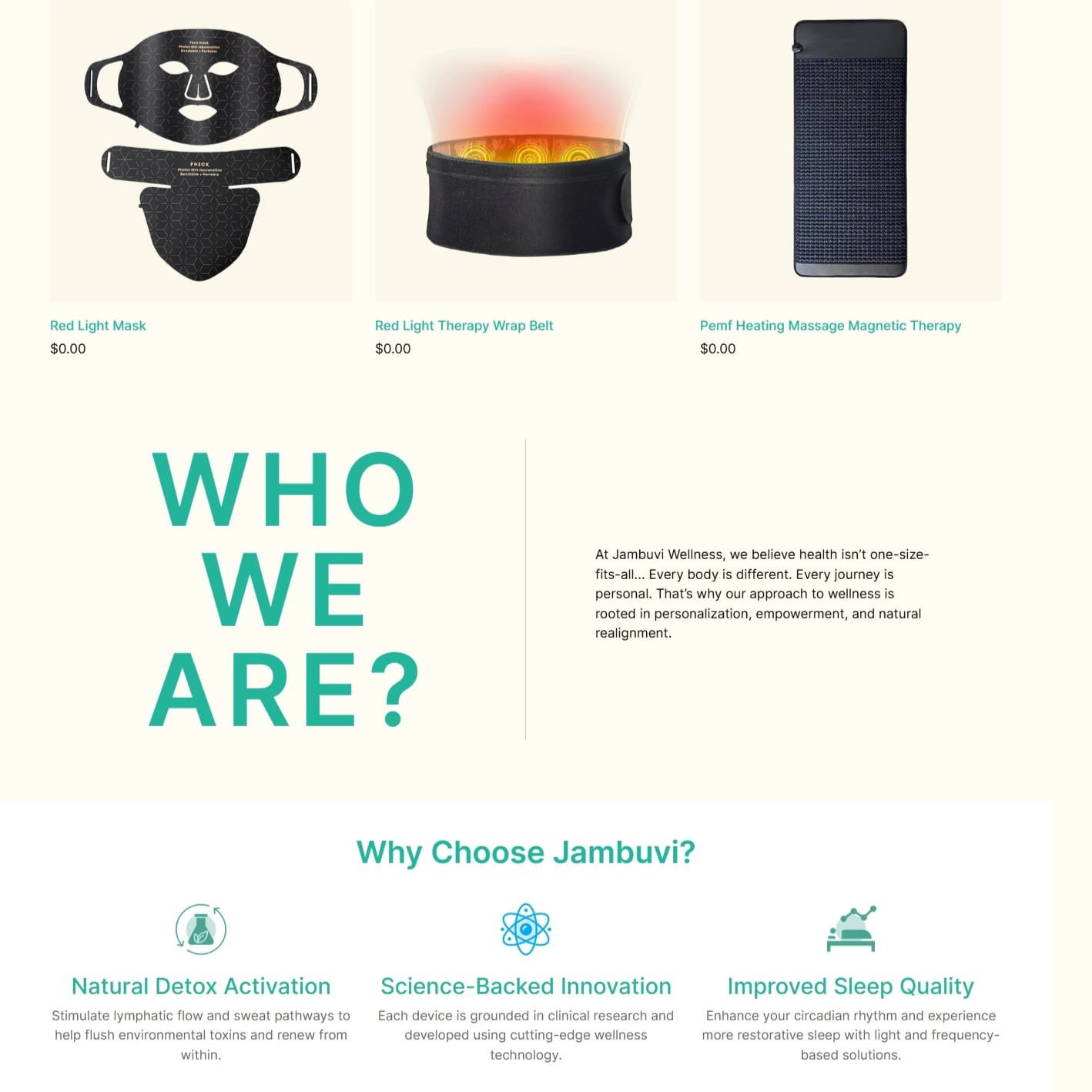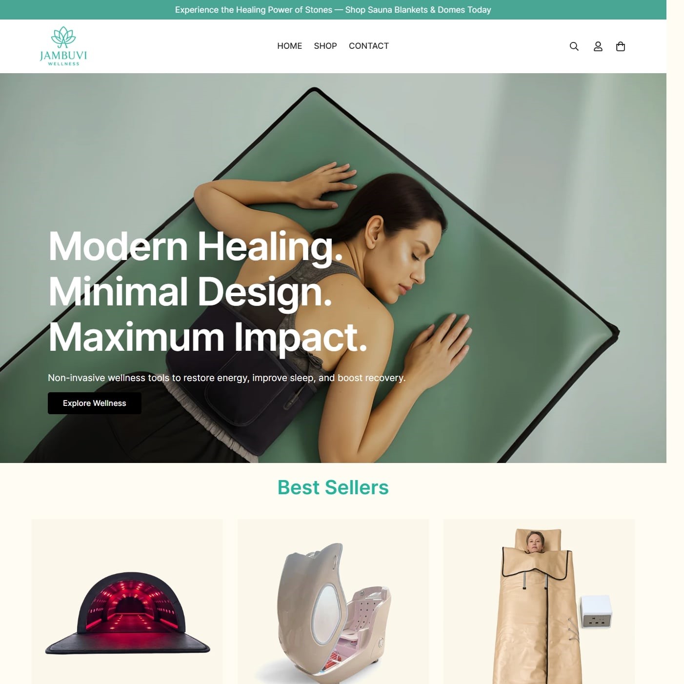 Jambuvi Wellness is a Shopify store selling wellness tech products like infrared sauna blankets, red-light therapy masks, and ozone capsules. It targets health-conscious users looking for non-invasive healing. The store promotes science-backed recovery with a clean, modern aesthetic.