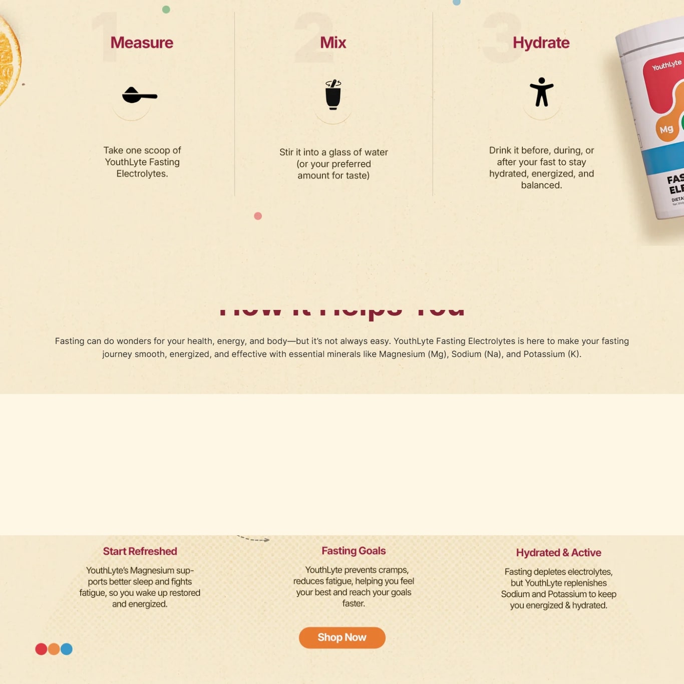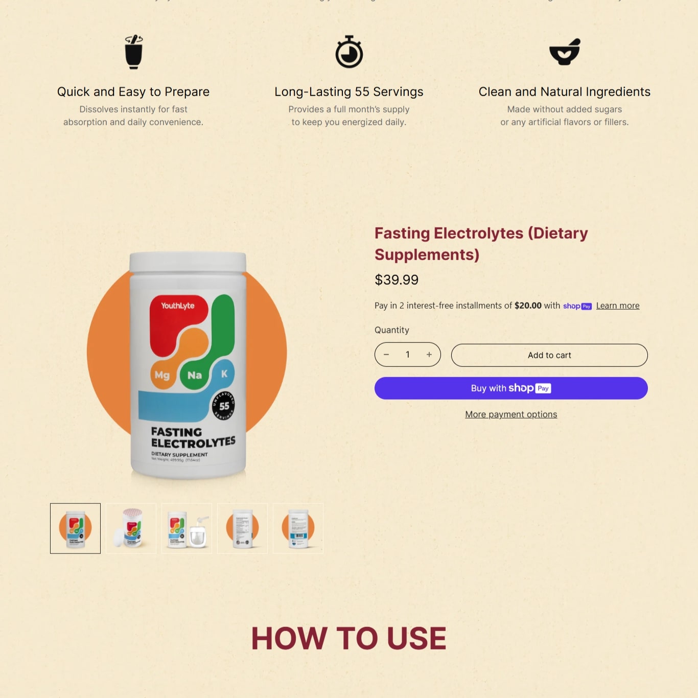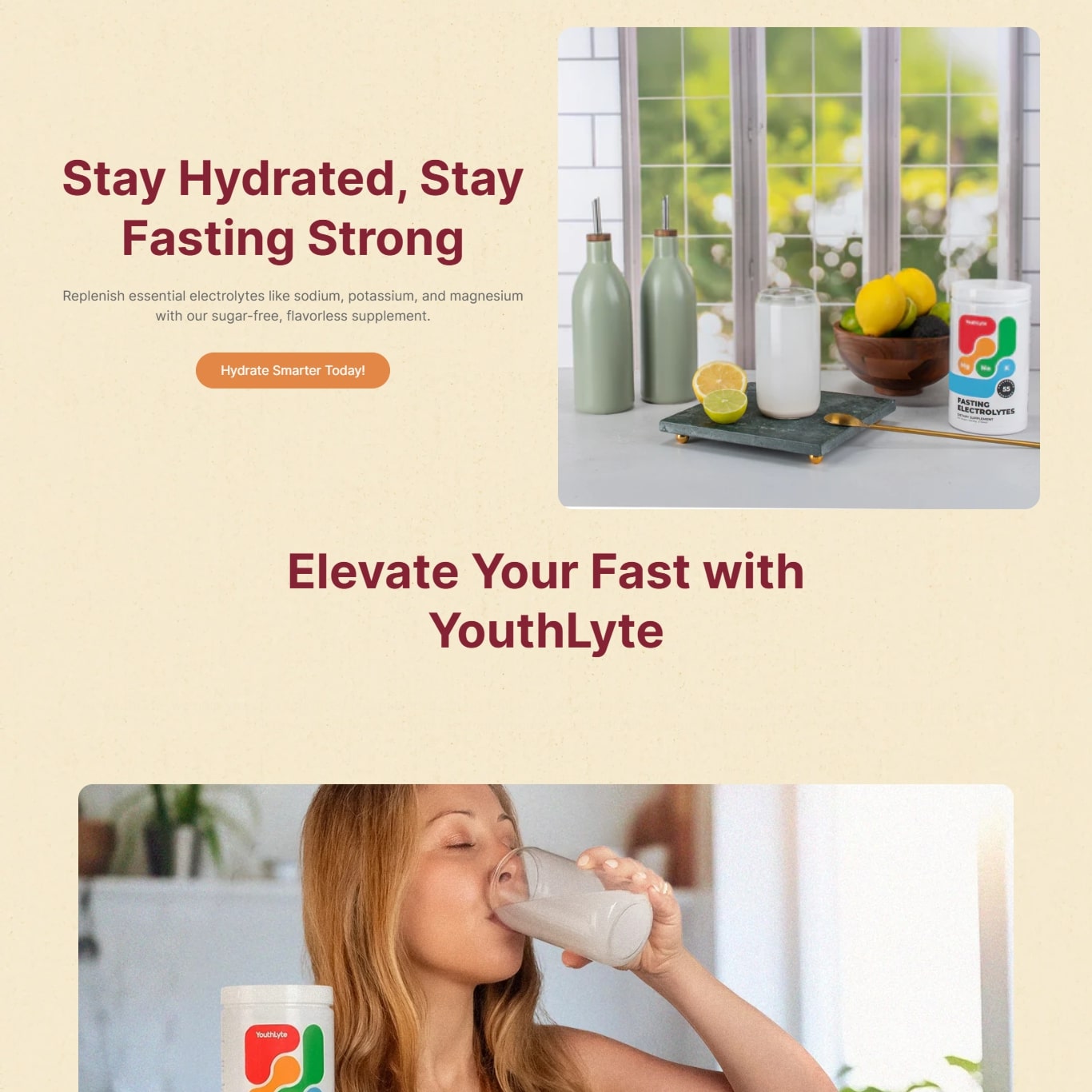 YouthLyte is a hydration-focused Shopify store selling electrolyte powder designed for fasting and fitness. The product is flavorless, sugar-free, and formulated with essential minerals. It appeals to health-conscious individuals seeking clean, effective hydration support.